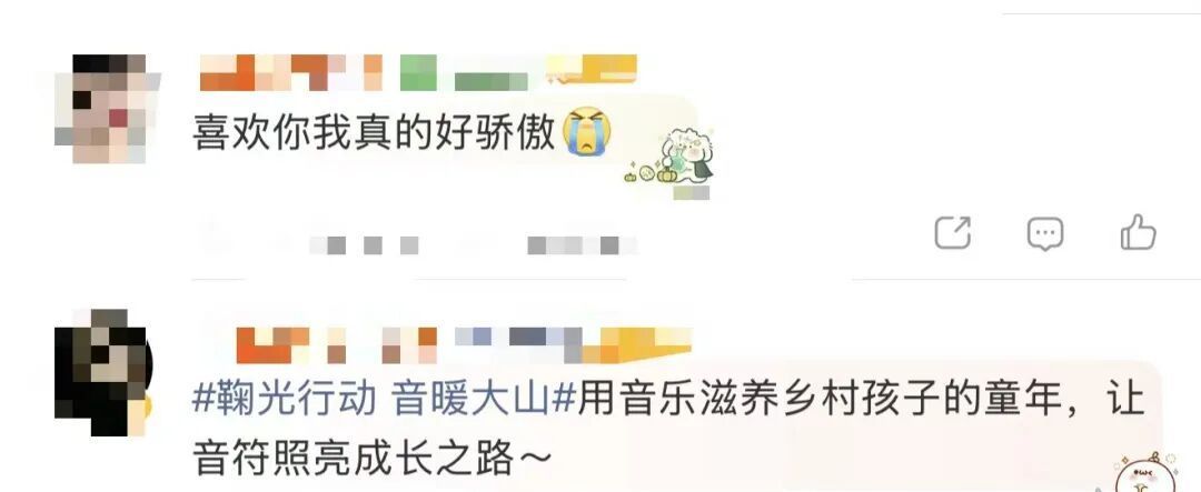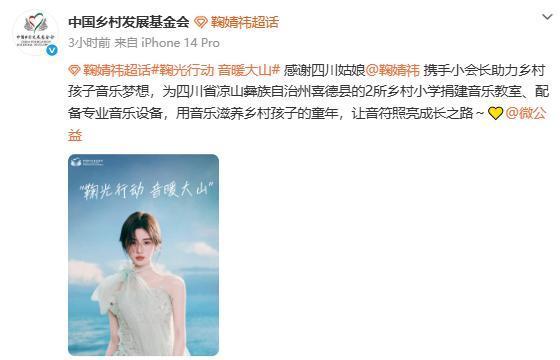 3月12日,@中国乡村发展基金会 发文:感谢四川姑娘 鞠婧祎 携手小会长助力乡村孩子音乐梦想,为四川省凉山彝族自治州喜德县的2所乡村小学捐建音乐教室、配备专业音乐设备,用音乐滋养乡村孩子的童年,让音符照亮成长之路~